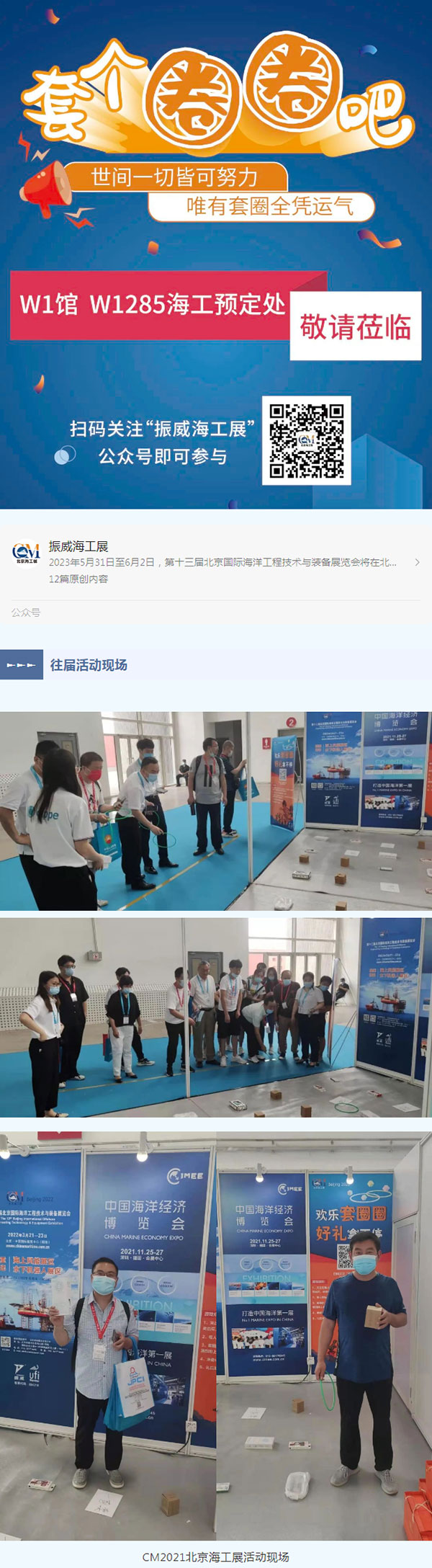 为活跃CM2023北京海工展展会现场氛围,所有关注北京海工展微信公众号的参观观众,均可于展期前往W1馆W1285海工预定处参与套圈活动,赢取精美礼品!