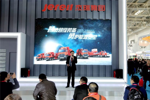 展会现场,杰瑞工程师做了“智造超级装备 勇护能源安全”为主题的演讲,展示了杰瑞涡轮压裂车、智能电控大管径连续油管设备、世界最大排量混配供液车、智能免破袋连续输砂装置等一系列杰瑞自主研发的、拥有智能控制系统的超级装备,高品质的油田专用设备和热情专业的技术讲解,给参观者留下了深刻的印象。