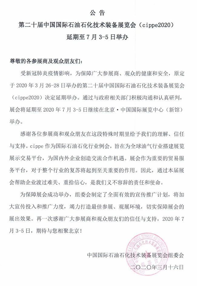受新冠肺炎疫情影响,原定于2020年3月26-28日举办的第二十届中国国际石油石化技术装备展览会(cippe2020),将延期至7月3日至5日在北京·中国国际展览中心(新馆)举行,欢迎您届时参展参观。