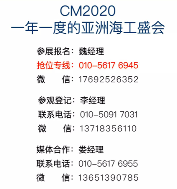 第十届北京国际海洋工程技术与装备展览会(CM2020)将于cippe2020同期举办。届时,将有65个国家和地区的1800家企业参展,其中世界500强企业46家,国际展团18个。同时,展会现场预计将有120000万人次的专业观众到展参观、洽谈。CM2020将搭建展示交流合作大平台,聚内外名企名士,共谋行业发展新路径,共襄产业发展大机遇!思辉流体将于现场恭候行业各界莅临、交流、洽谈。
