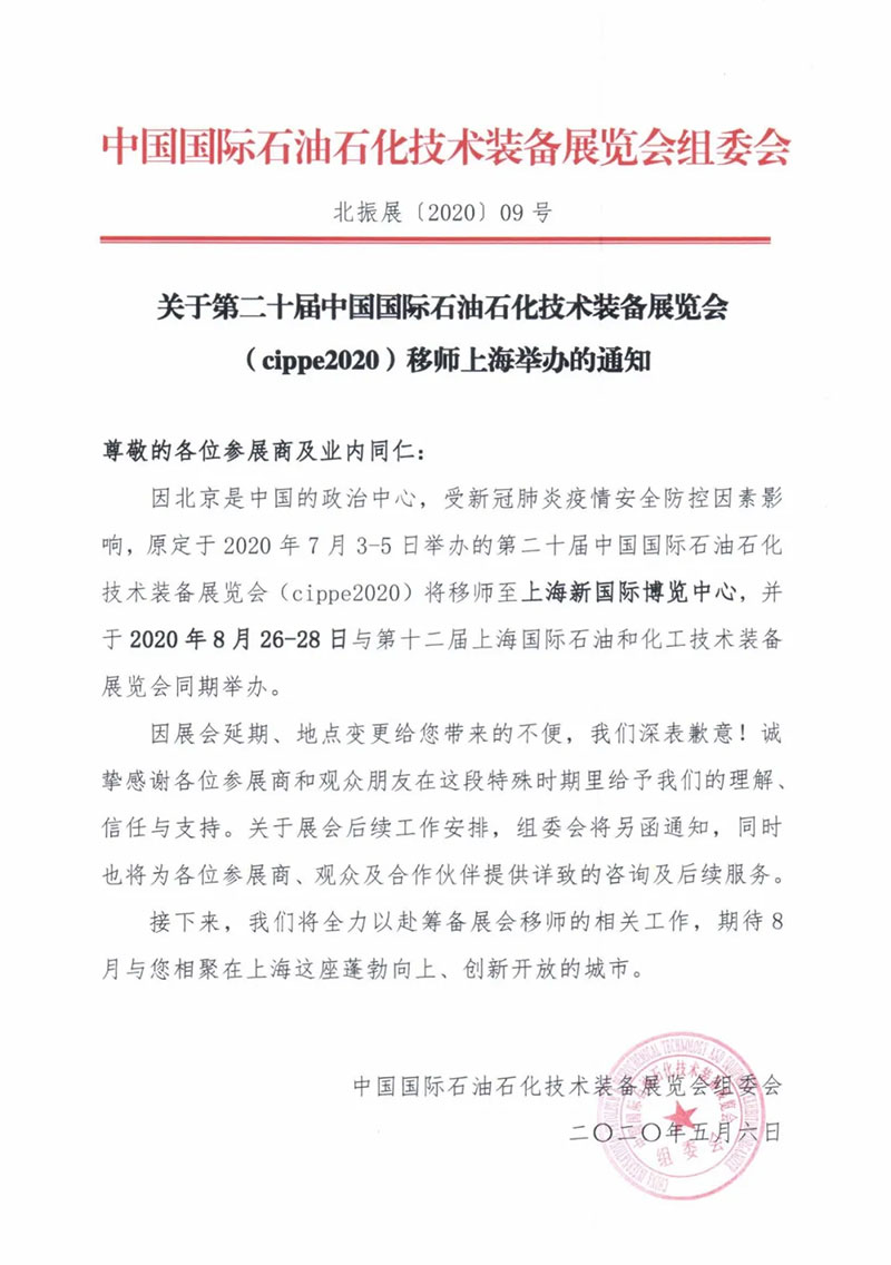 因北京是中国的政治中心,受新冠肺炎疫情安全防控因素影响,原定于2020年7月3-5日举办的第二十届中国国际石油石化技术装备展览会(cippe2020)将移师至上海新国际博览中心,并于2020年8月26-28日与第十二届上海国际石油和化工技术装备展览会同期举办,欢迎您届时参展参观。