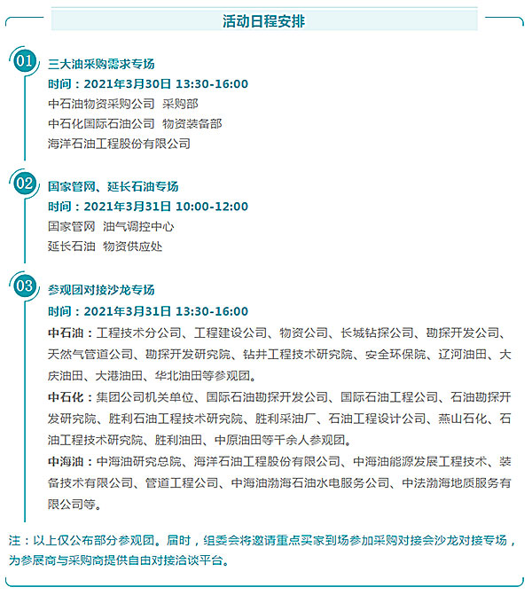 为更好的服务国内外参展商与参观商,保障企业参展、参会实效。cippe2021将继续在展会期间举办“采购对接会”活动,为参展商与采购商搭建"一对一"油气对接交流平台,共享行业顶级资源。欢迎参展商与采购商积极报名参与。