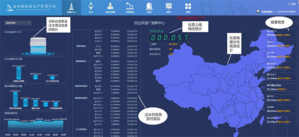物联网大数据平台:用于油气田开采生产工艺全过程,涵盖注水流程监控、油井生产管理、站内生产检测、视频监控、钻井数据采集及随钻数据采集。